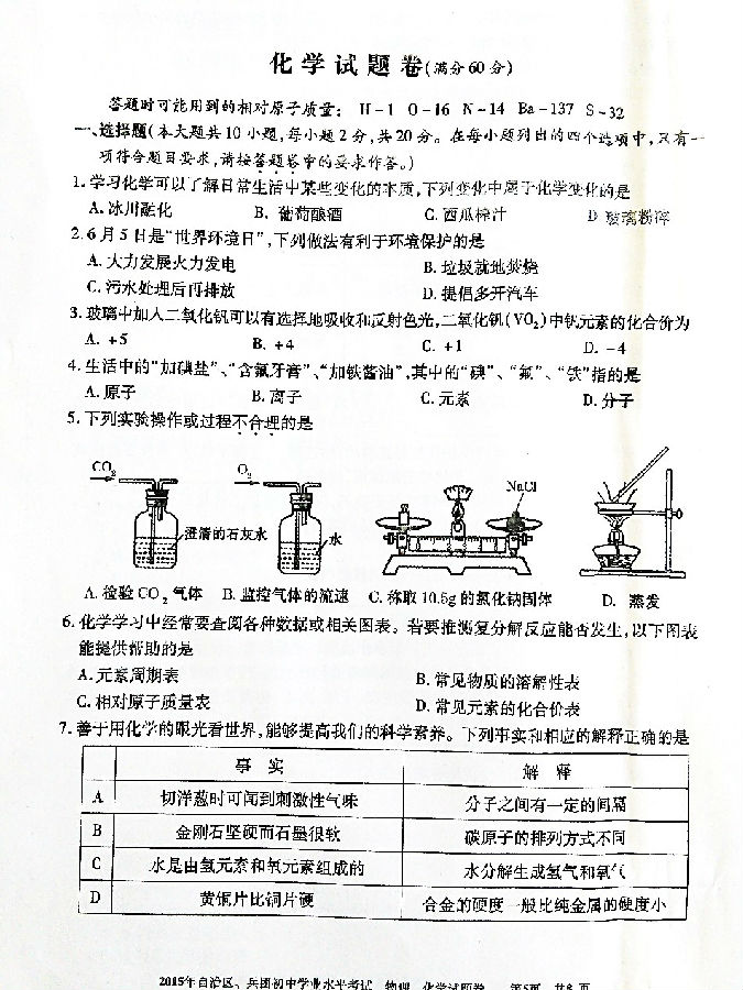 来源 : 网络 07月09日 11:29 关键字 : 新疆中考化学试卷及答案 中考化学