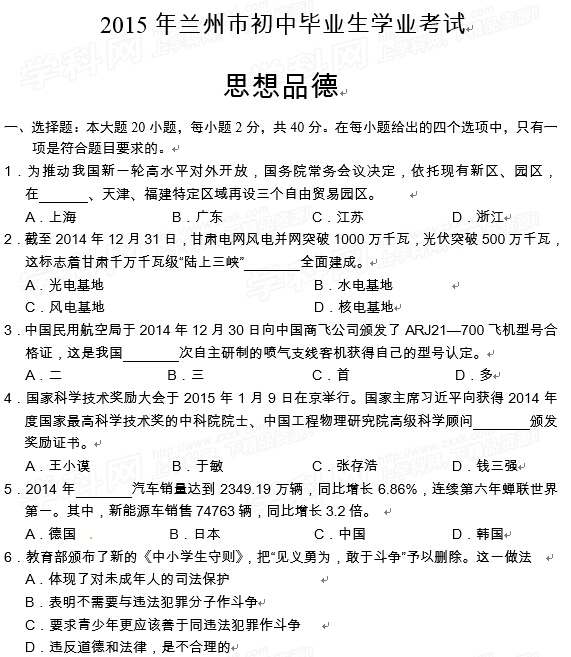 来源 : 网络 07月08日 14:37 关键字 : 甘肃兰州中考政治试卷及答案 中考政治