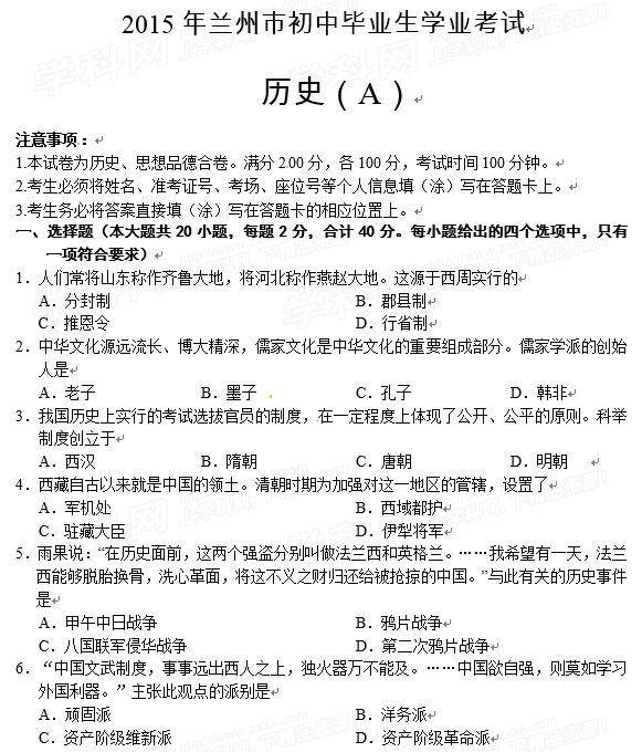 来源 : 网络 07月08日 15:11 关键字 : 甘肃兰州中考历史试卷及答案 中考历史