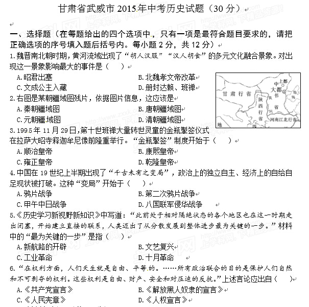 来源 : 网络 07月07日 11:01 关键字 : 甘肃临夏州中考历史试卷及答案 中考历史