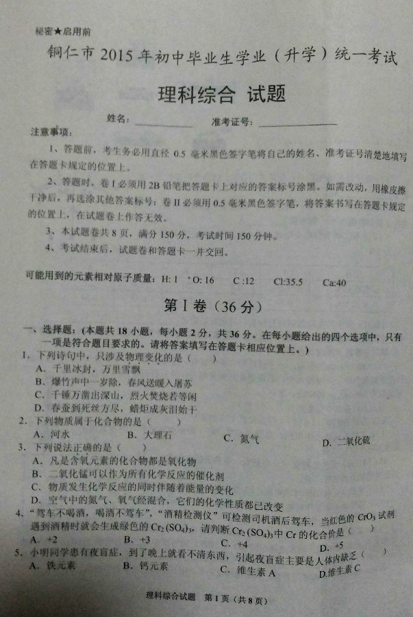来源 : 网络 07月02日 15:18 关键字 : 贵州铜仁中考化学试卷及答案 中考化学