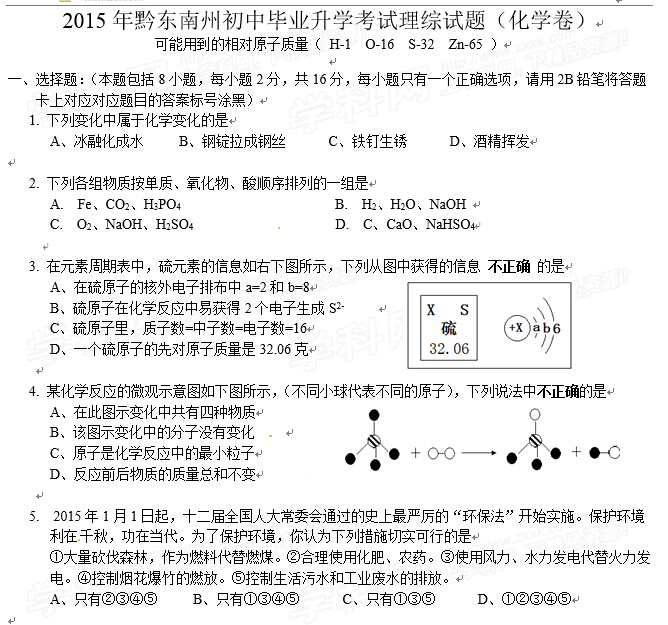 来源 : 网络 07月02日 16:40 关键字 : 贵州黔东南中考化学试卷及答案 中考化学