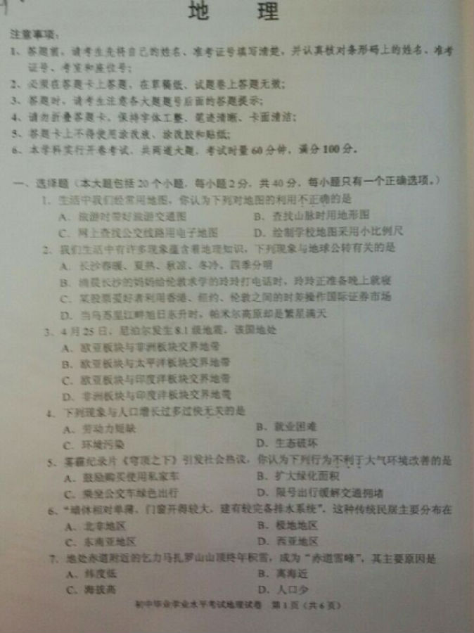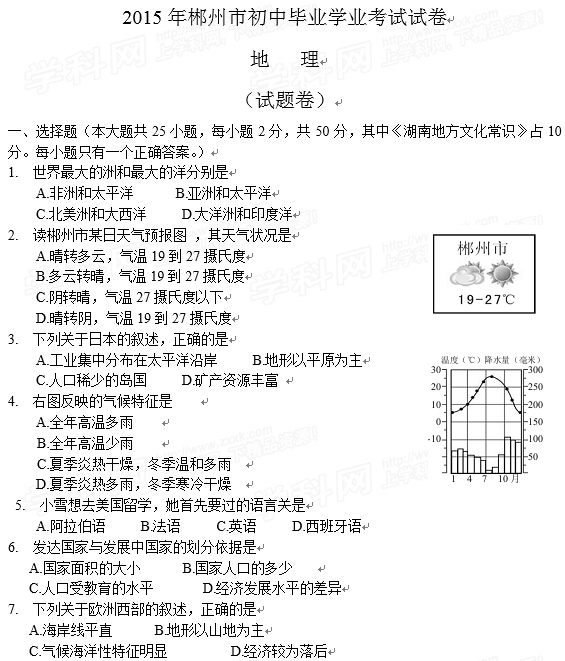 来源 : 网络 07月01日 15:10 关键字 : 湖南郴州中考地理试卷及答案 中考地理