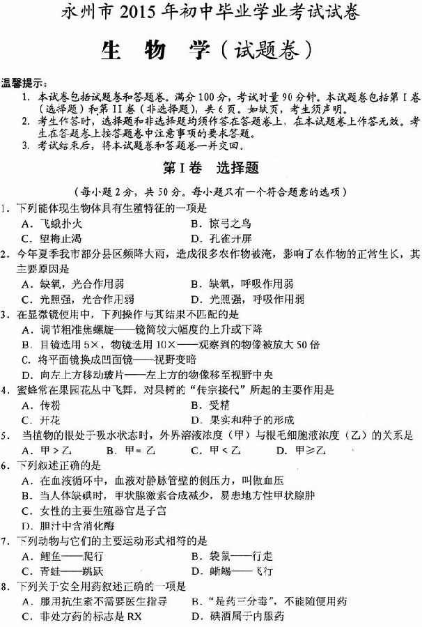 来源 : 网络 07月01日 14:52 关键字 : 湖南永州中考生物试卷及答案 中考生物