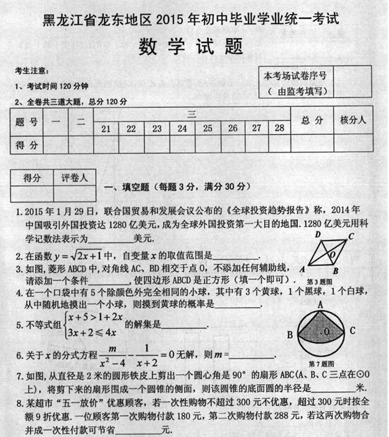 来源 : 网络 06月30日 16:03 关键字 : 黑龙江佳木斯中考数学试卷及答案 2015中考