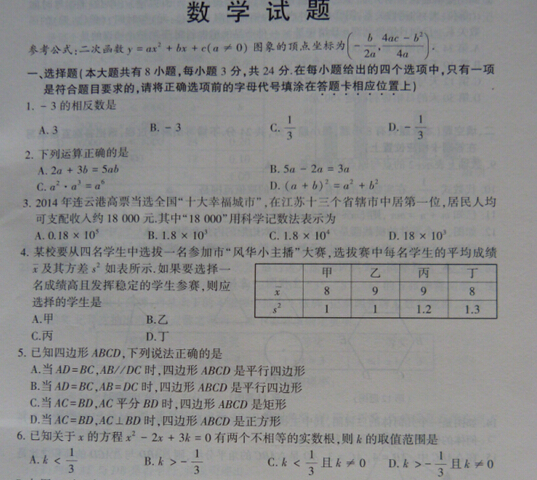来源 : 网络 06月17日 16:11 关键字 : 江苏连云港中考数学试卷及答案 2015中考数学